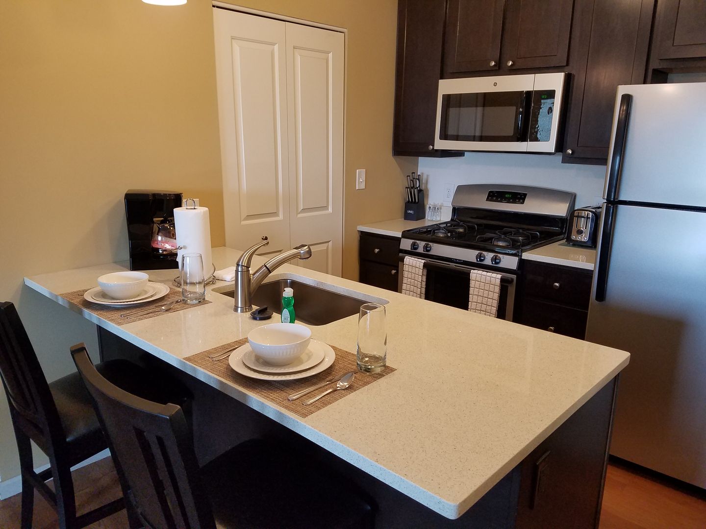 Discover this fantastic two-bedroom, two-bathroom unit located on the second floor. Enjoy the convenience of having an in-unit washer and dryer. You’ll love relaxing in the modern kitchen, which features contemporary lighting, wood-style plank flooring, and elegant quartz countertops. The kitchen is equipped with an undermount sink, a pull-out sprayer faucet, and GE stainless steel appliances, including a gas range, a frost-free refrigerator and freezer with an ice maker, a microwave/vent hood, a dishwasher, and a garbage disposal.